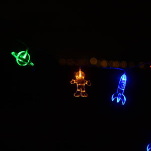 Take off for an adventure of a lifetime with this string of galaxy-themed fairy lights. Each strip comes with an array of acrylic astronaut, rocket ship and planet designs in a rainbow colour.