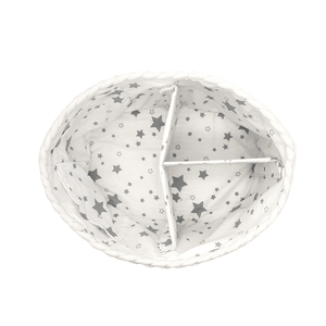 Our nappy basket is lined with white fabric featuring silver stars. White weave and a sturdy rim combine to keep your nappy basket upright while looking gorgeous. Keep it in the nursery, on the changing table, or anywhere else you change baby nappies. Your nursery and home can be free of clutter, and you’ll have everything you need for a smooth and hassle-free nappy change time.